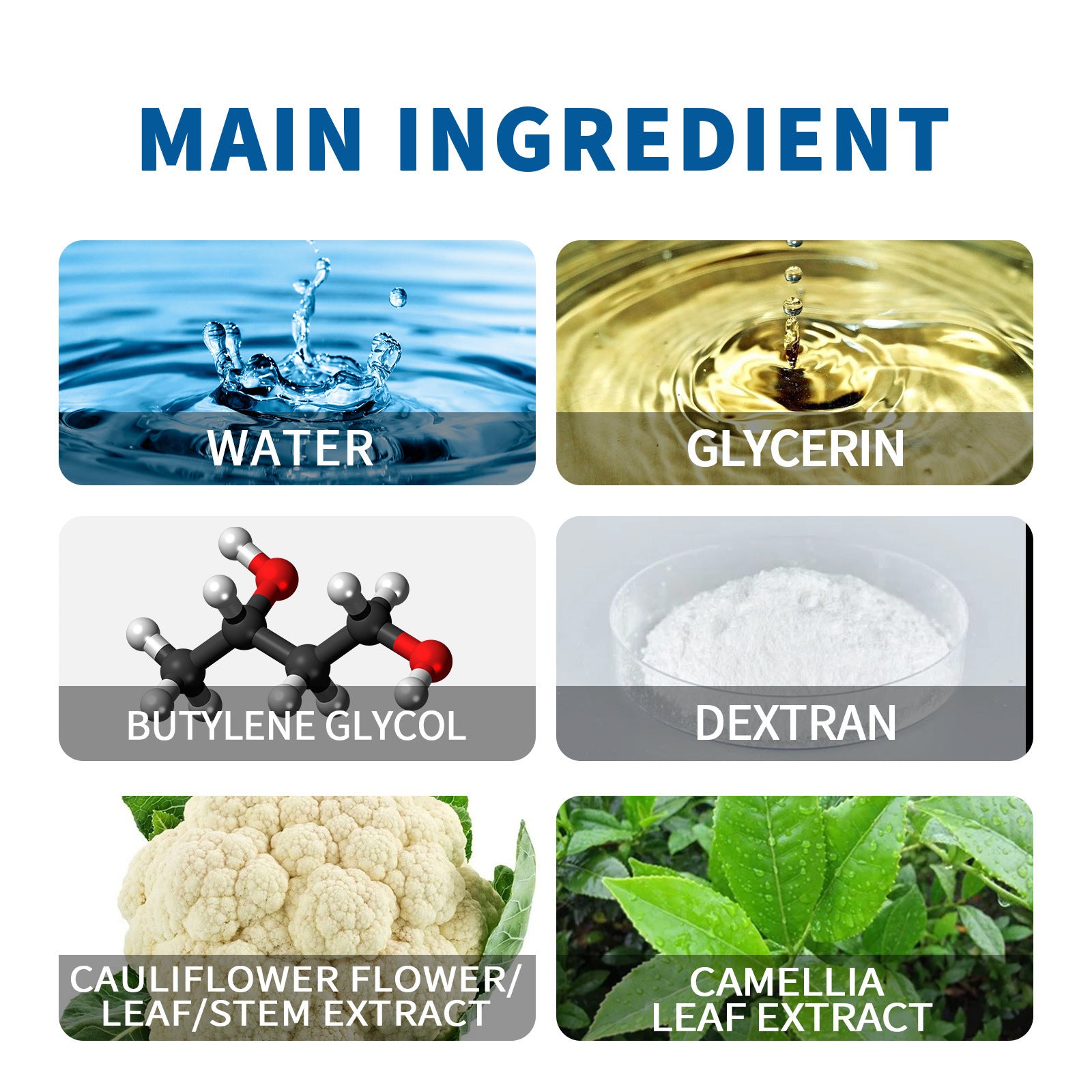 Samengesteld uit hoogwaardige ingrediënten zoals water, glycerine, butyleenglycol, dextraan, bloemkool-extract (bloem/blad/stengel) en camelia-bladextract. Deze ingrediënten werken synergetisch samen om het haar en de hoofdhuid op milde maar effectieve wijze te verzorgen.